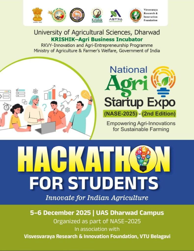 Organized by the University of Agricultural Sciences, Dharwad, in association with Visvesvaraya Research & Innovation Foundation (VTU Belagavi), this event is part of the larger National Agricultural Science Exhibition (NASE-2025). Supported by the Krishik PN Foundation, Krishik-Agri Business Incubator, and the Ministry of Agriculture & Farmer’s Welfare (GoI) under the RKVY-Innovation and Agri-Entrepreneurship Programme, the hackathon promises to be a hub of creativity, technology, and purpose.