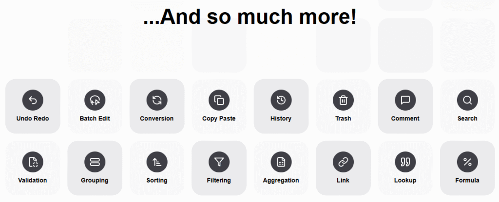 • A spreadsheet-style interface (rows, columns, tables) that is familiar and accessible.